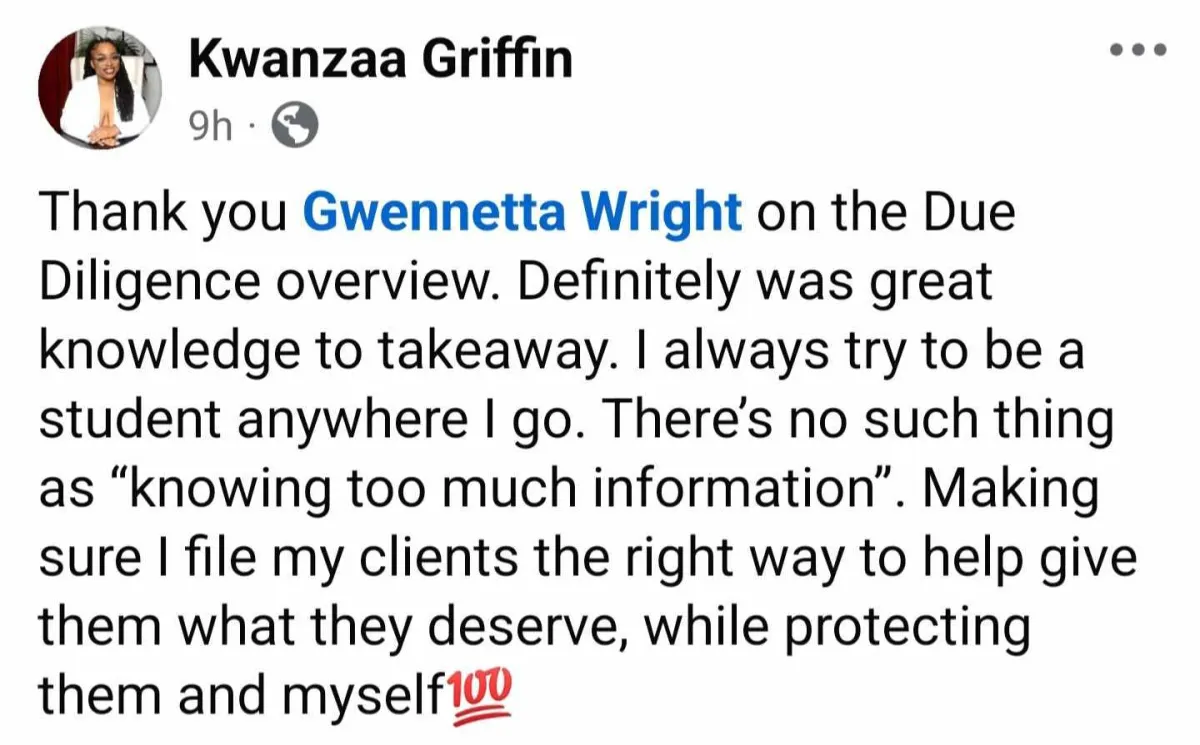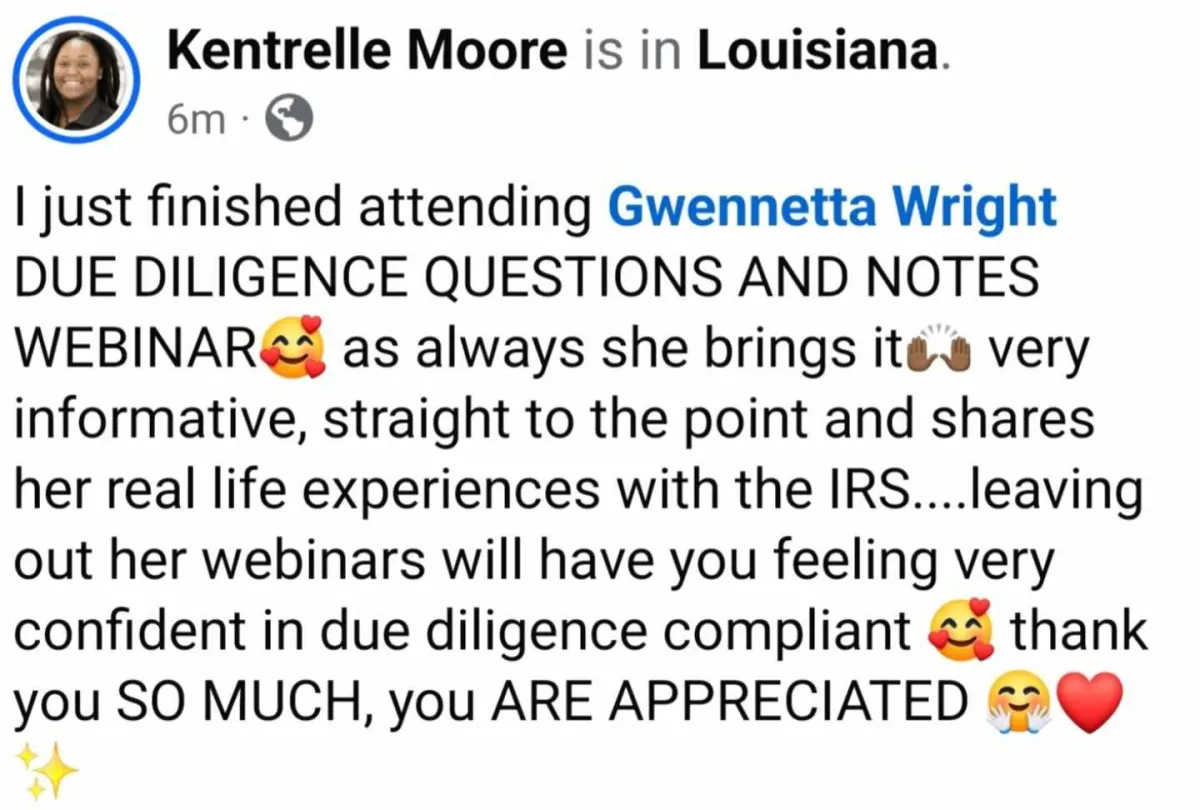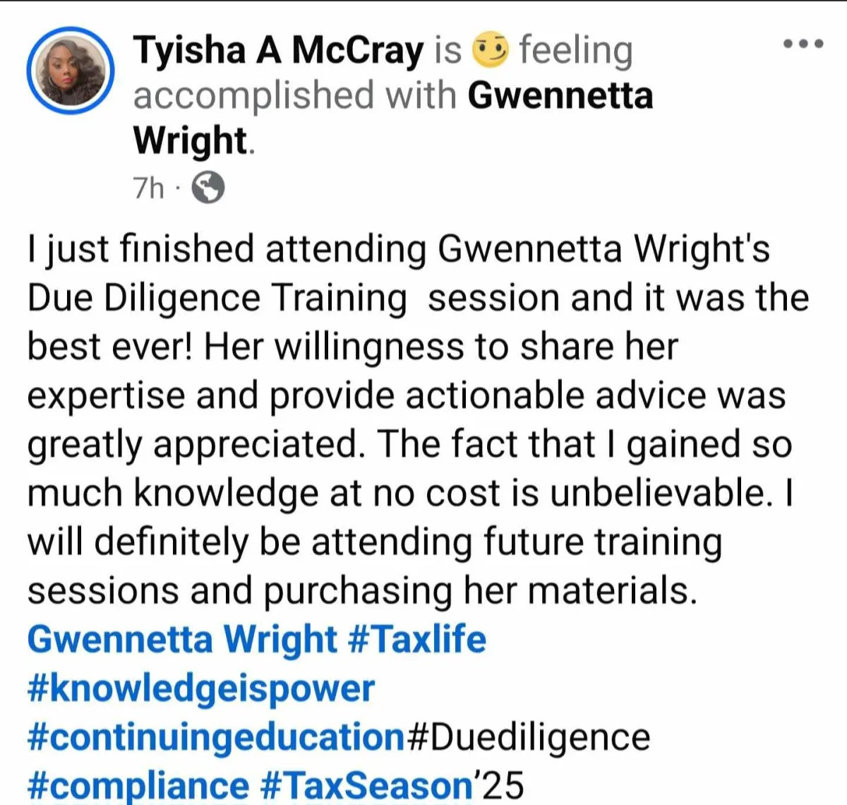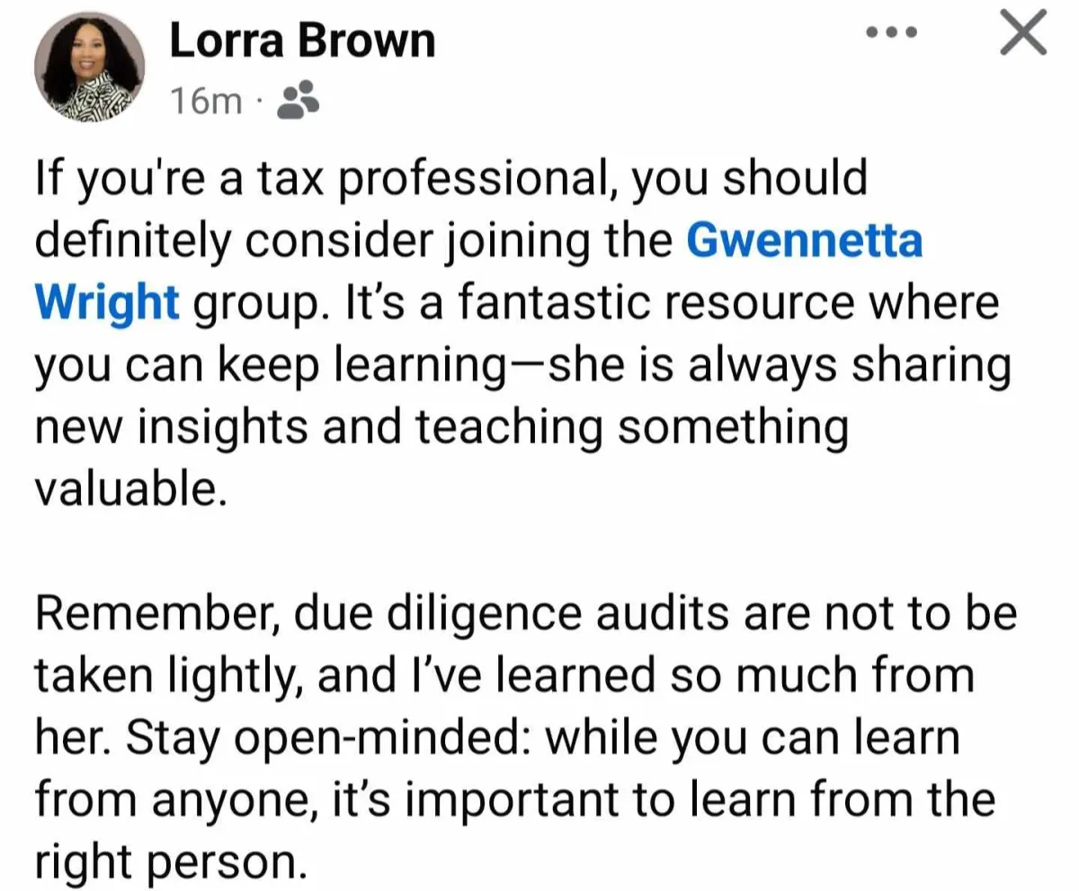 If you're a tax professional, you should definitely consider joining the Gwennetta Wright group. It's a fantastic resource where you can keep learning-she is always sharing new insights and teaching something valuable. Remember, due diligence audits are not to be taken lightly, and I've learned so much from her. Stay open-minded: while you can learn from anyone, it's important to learn from the right person.