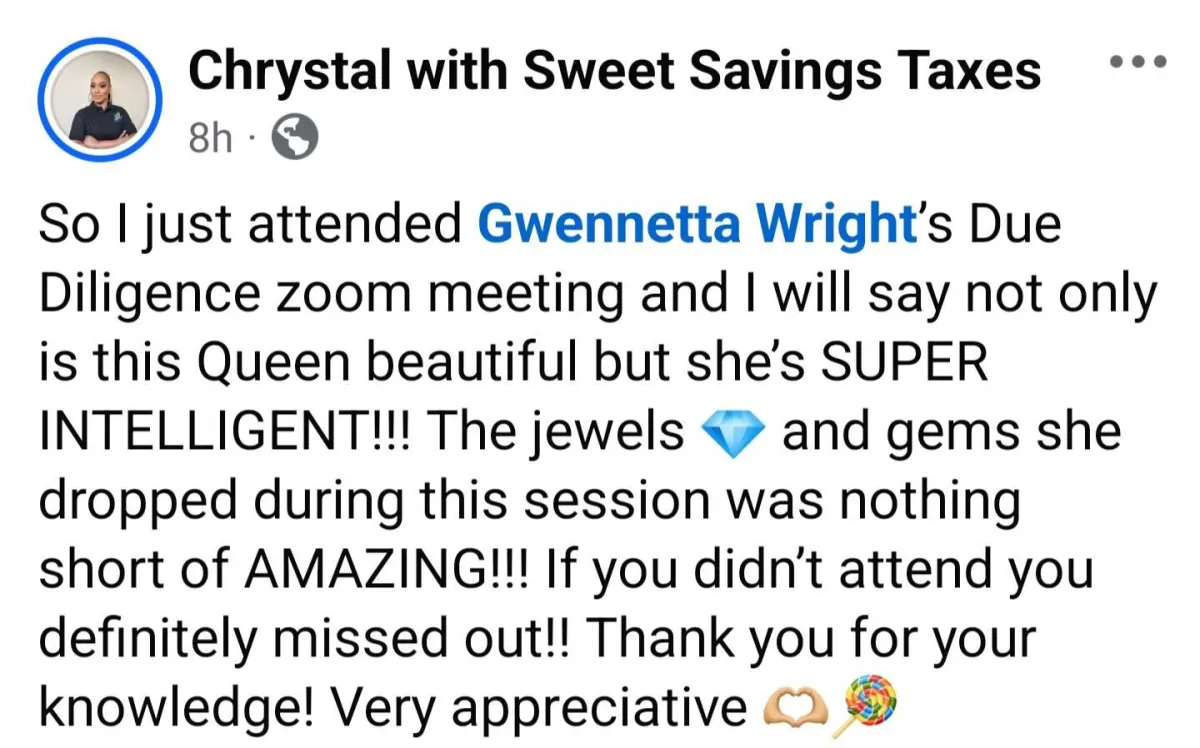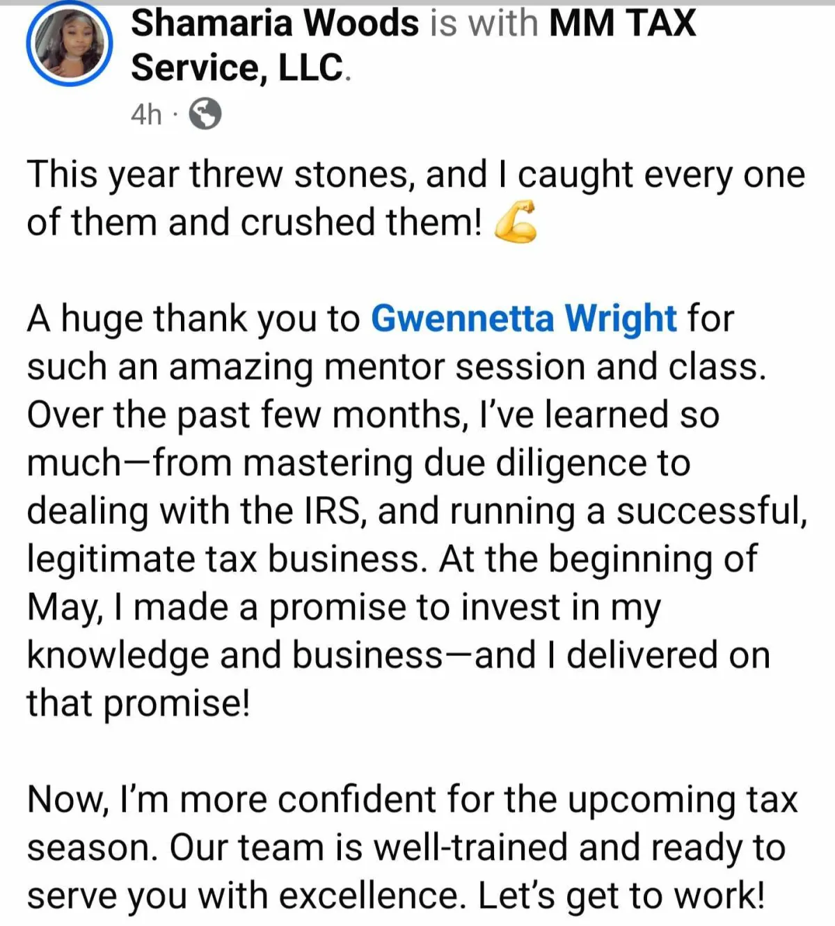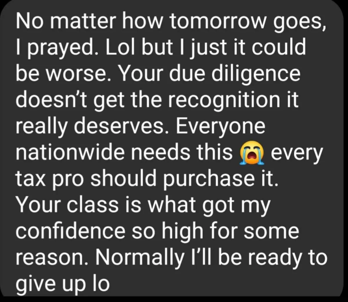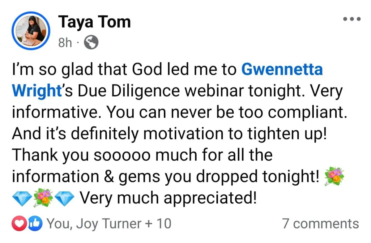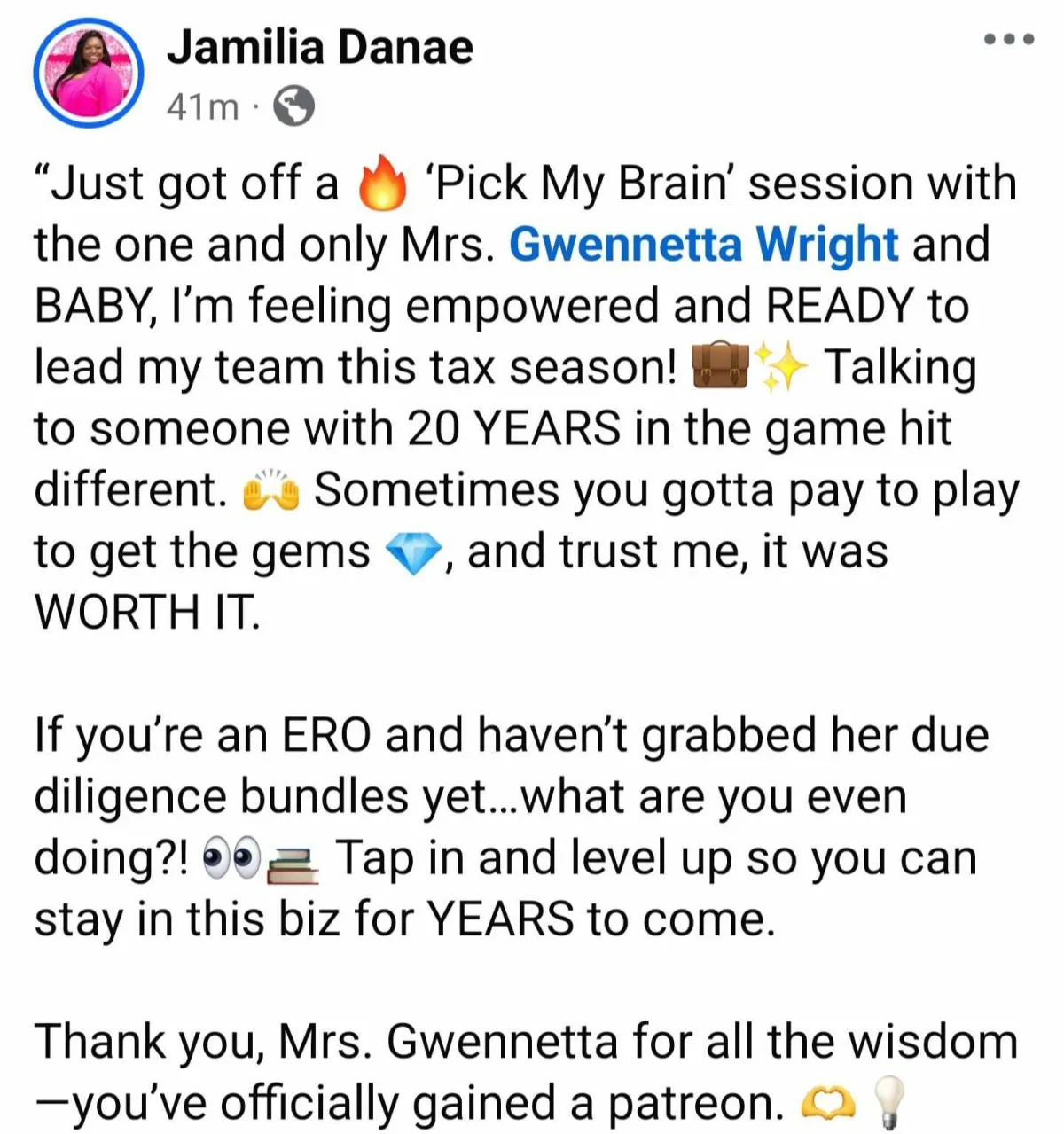 If you're a tax professional, you should definitely consider joining the Gwennetta Wright group. It's a fantastic resource where you can keep learning-she is always sharing new insights and teaching something valuable. Remember, due diligence audits are not to be taken lightly, and I've learned so much from her. Stay open-minded: while you can learn from anyone, it's important to learn from the right person.